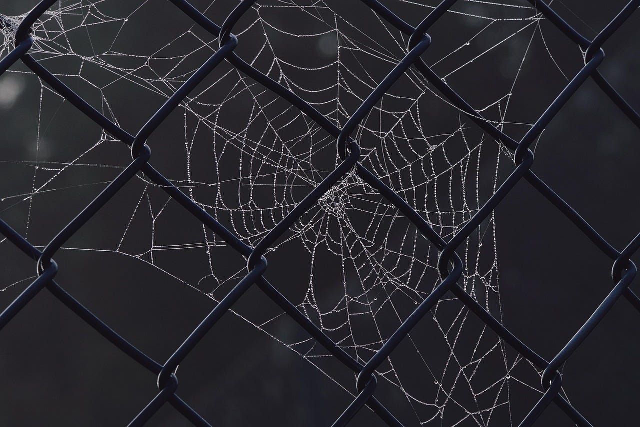 Image description: a delicate spider’s web viewed through a chain link fence. Image by Wolfgang Eckert from Pixabay