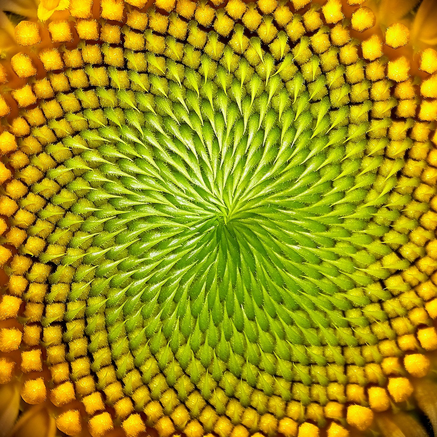 Image description: a close-up of the center of a sunflower, displaying an amazing spiraling pattern of seeds. Photo by Mathew Schwartz on Unsplash.