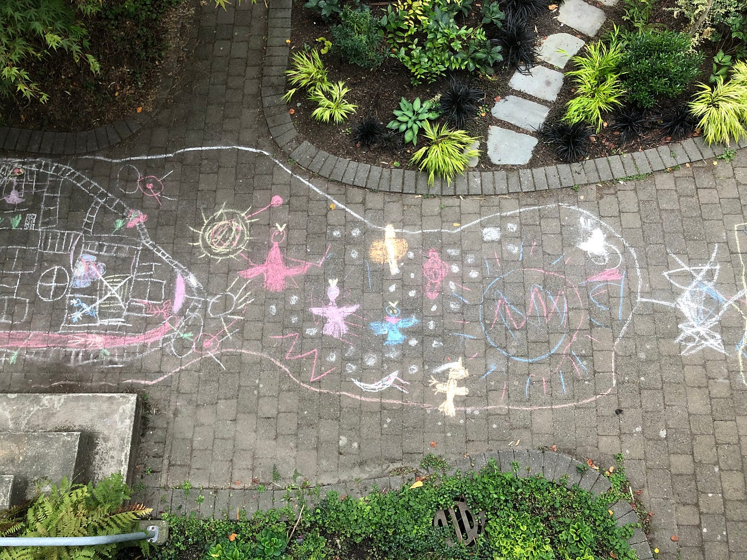 Photo: kids chalk art in the courtyard at Jackson Place Cohousing, viewed from my balcony.