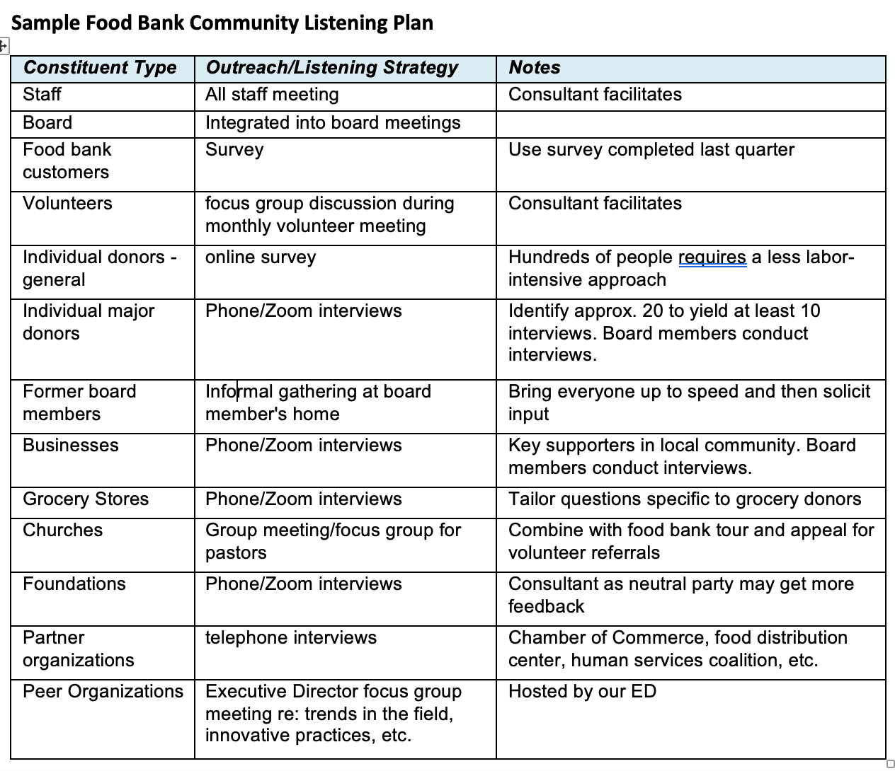 Map out who your key constituents are. Think about the types of people you would like to connect with and how best to consult them during a planning process. Thoughtful constituent listening includes the people served by your nonprofit, the people who care about your work (donors, volunteers), and partners (program partners, key referral sources, funders). Input can be collected via a survey, focus groups, individual interviews, or special events. Here is a sample outreach plan for a food bank with a number of potential constituent groups and sample strategies.