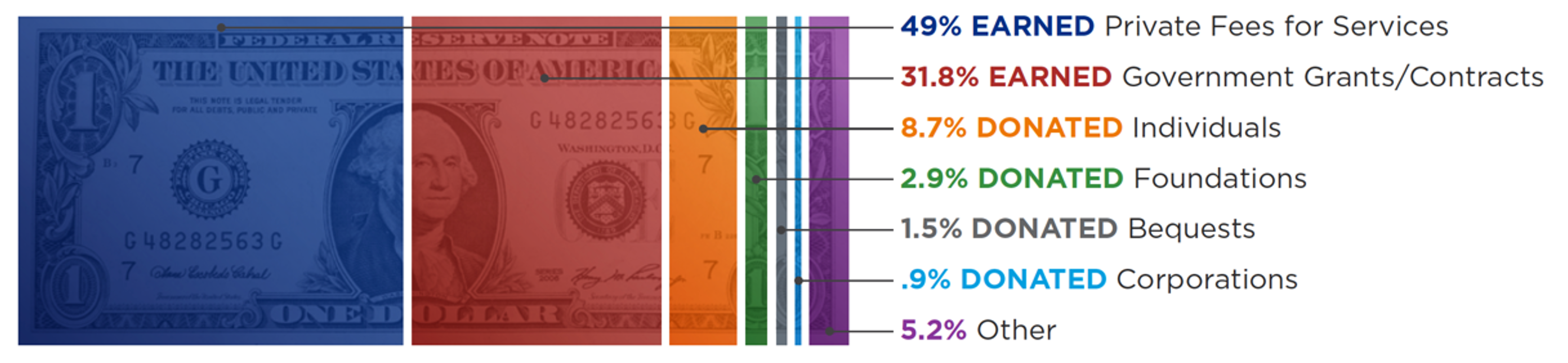 Image description: A graphic of a dollar bill divided into slices showing the breakdown of nonprofit revenue nationally. The breakdown is: 49% fees for services, 31.8% government grants/contracts, 8.7% donated by individuals, 2.9% donated by foundations, 1.5% donated by bequests, .9% donated by corporations, 5.2% other. Source: Nonprofit Impact Matters report by National Council of Nonprofits.