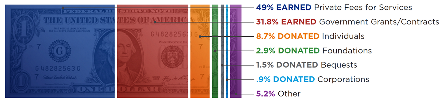 Time for a reminder of where the nonprofit sector gets its funding. We typically exaggerate the importance of philanthropic contributions and underestimate how tied our fate is with government. In fact, we are the low-cost provider of so many public services that would have been delivered by government in the past (affordable housing, education, hospitals, etc). There is much to say about this topic and the need to renegotiate the relationship between government and nonprofits, but I am highlighting this today to remind us all that reductions in federal investment will reverberate quickly in the nonprofit sector.