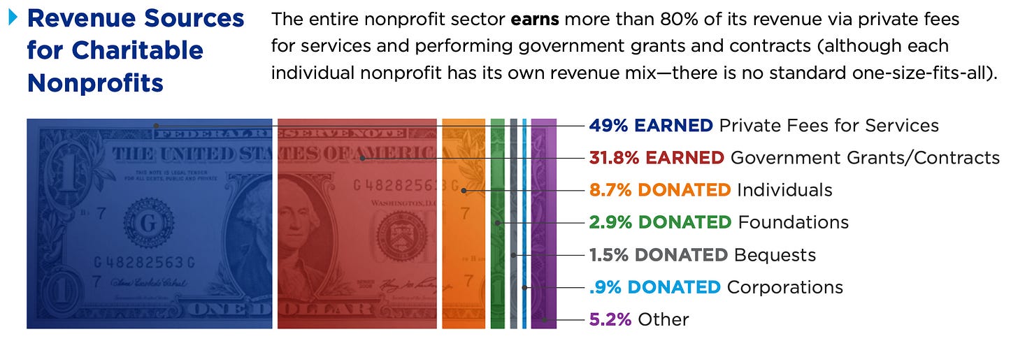 Where does nonprofit revenue come from? We need statistics on where the sector’s revenue comes from so that we can make realistic decisions about how to focus fundraising and earned income strategies to maximize return on effort. I have observed as a consultant that board members can have some interesting ideas, often overestimating the importance of certain revenue streams (most often, foundation grants and corporate contributions). I often share the graphic below from the National Council of Nonprofits’ report Nonprofit Impact Matters to give clients some perspective, with the caveat that different types of nonprofits rely on different mixes of revenue. As you can see, it may be a mistake for an organization to pin its hopes for future fundraising success too heavily on foundation revenue (2.9% of nonprofit revenue) and corporations (.9%).