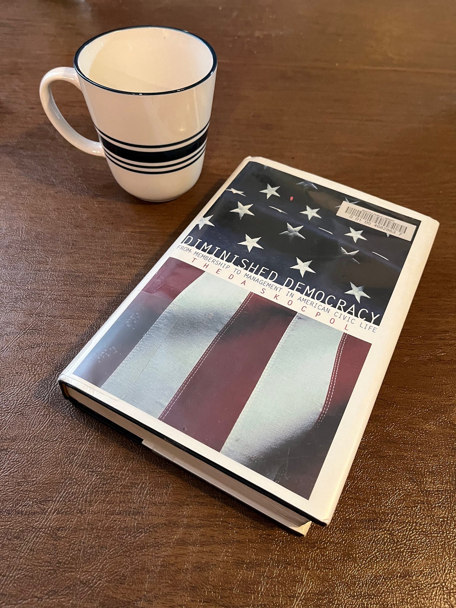 Image description: A copy of the book Diminished Democracy on my table with a coffee cup.