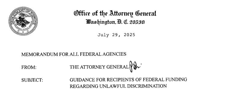 At the end of July, US Attorney General Pam Bondi issued a memo with “guidance for recipients of federal funding regarding unlawful discrimination.” This memo also does not have the force of law, but it provides “best practices as non-binding suggestions to help entities comply with federal antidiscrimination laws and avoid legal pitfalls.” It is helpful in that it outlines the administration’s position and provides specific examples of the types of preferential programs, hiring practices, and trainings may run afoul of antidiscrimination laws. It is one tool to help nonprofits, particularly those that receive federal funds, manage risk.